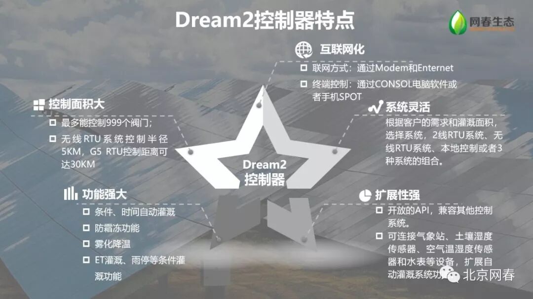 DREAM2(梦幻)控制器能够控制多个灌溉系统的首部,采用单台控制器,就能实现对大面积的上万亩的灌溉系统集中管理和控制。