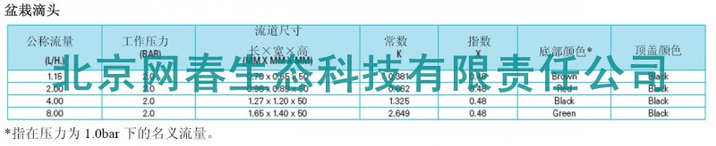 5种流量可供选择; 纽扣式滴头插入到厚壁管线上(0.9、1.0及1.2mm),盆栽滴头接于3*5mm毛管上;