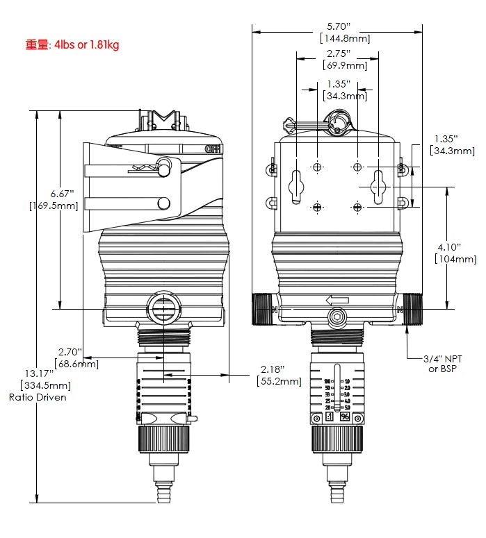 | SuperDos 450.3%2.5%5.0% 运行流量0.15 - 45 gpm0.15 - 45 gpm0.15 - 45 gpm配比比例0.025% - 0.30%1:4000 - 1:3330.20% - 2.50%1:500 - 1:400.40% - 5.0%1:250 - 1:20运行压力6 - 100 psi6 - 100 psi6 - 100 psi安装螺纹1 " npt/bsp1 " npt/bsp1 " npt/bsp |